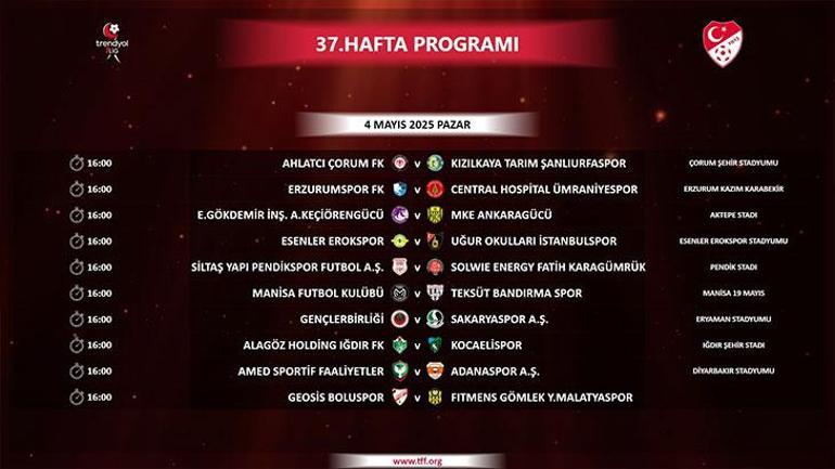 Trendyol 1. Lig’de 37. haftanın programı Türkiye Futbol Federasyonu’nun (TFF) internet sitesinden açıklandı.