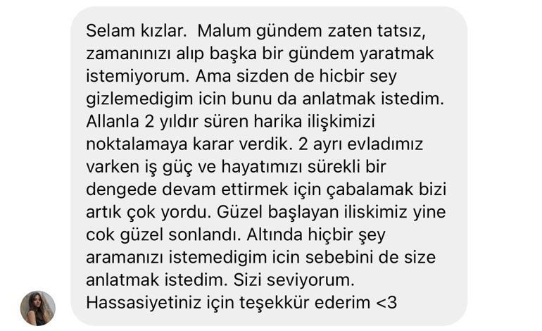 “Sizden hiçbir şey gizlemediğim için bunu da anlatmak istedim. Allan’la 2 yıldır süren şahane alakamızı noktalamaya karar verdik. 2 başka evladımız varken iş, güç ve hayatımızı daima istikrarda devam ettirmek için çabalamak bizi artık çok yordu. Hoş başlayan bağımız yeniden çok hoş sonlandı. Altında hiçbir şey aramanızı istemediğim için sebebini de size anlatmak istedim. Sizi seviyorum. Hassasiyetiniz için teşekkür ederim.”