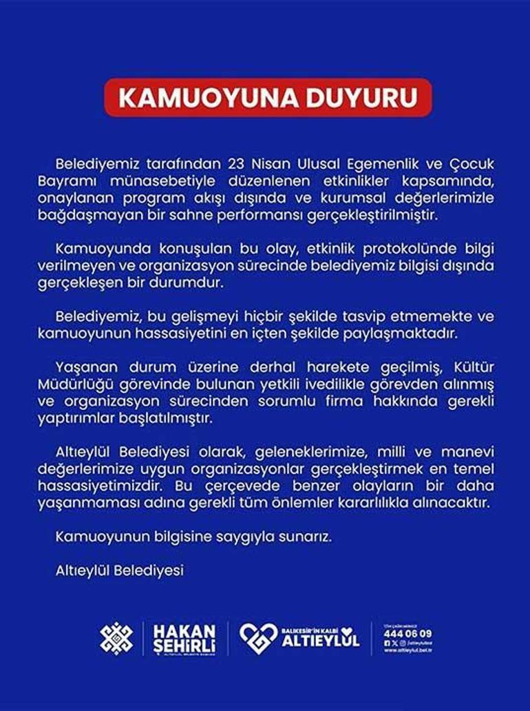 Altıeylül Belediyesi tarafından bahisle ilgili yapılan açıklamada ise “Belediyemiz tarafından 23 Nisan Ulusal Egemenlik ve Çocuk Bayramı münasebetiyle düzenlenen etkinlikler kapsamında, onaylanan program akışı dışında ve kurumsal değerlerimizle bağdaşmayan bir sahne performansı gerçekleştirmiş. Kamuoyunda konuşulan bu olay, aktiflik protokolünde bilgi verilmeyen ve tertip sürecinde belediyemiz bilgisi dışında gerçekleşen bir durumdur. Belediyemiz, bu gelişmeyi hiçbir biçimde tasvip etmemekte ve kamuoyunun hassasiyetini en içten biçimde paylaşmaktadır. Yaşanan durum üzerine derhal harekete geçilmiş, Kültür Müdürlüğü vazifesinde bulunan yetkili acilen misyondan alınmış ve tertip sürecinden sorumlu firma hakkında gerekli yaptırımlar başlatılmıştır. Altıeylül Belediyesi olarak, geleneklerimize, ulusal ve manevi kıymetlerimize uygun tertipler gerçekleştirmek en temel hassasiyetimizdir. Bu çerçevede misal olayların bir daha yaşanmaması ismine gerekli tüm tedbirler kararlılıkla alınacaktır. Kamuoyunun bilgisine hürmetle sunarız” denildi.