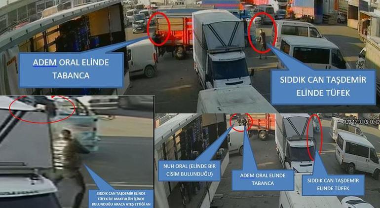 Bu ortada silahlı hengameye ait güvenlik kamera imgeleri ortaya çıktı. DHA’nın ulaştığı manzaralarda, Oral ve Taşdemir ailesinin kamyonlarının yan yana geldiği, Oral ailesinin içinde olduğu kamyonun hafif biçimde Taşdemir ailesinin kamyonunun önüne kırdığı, bu sırada tarafların kamyondan indiği ve silahlı çatışmanın çıktığı, Adem ve Nuh Oral’ın dışarıda olduğu sırada kamyonda bekleyen Kontratlı Er Uzun’un ise tüfekle Sıddık Can Taşdemir tarafından vurulduğu görüldü. Ayrıyeten, Sıddık Can Taşdemir’in birinci ateşi ettikten 7 dakika sonra yine kamyona hakikat süratle koştuğu ve tekrar ateş ettiği görüldü. Öbür yandan, hal kompleksi içinde yer alan öteki esnafların da çatışma sırasında panikle sağa sola kaçıştığı kameralara yansıdı.