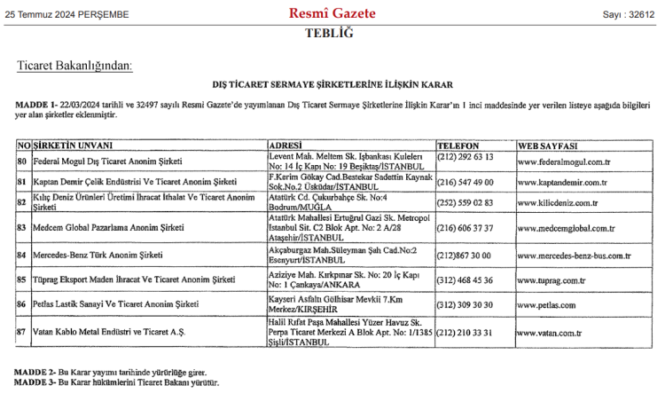 Ticaret Bakanlığı’nın Dış Ticaret Sermaye Şirketlerine İlişkin Karar Tebliği, Resmi Gazete’de yayımlanarak yürürlüğe girdi.