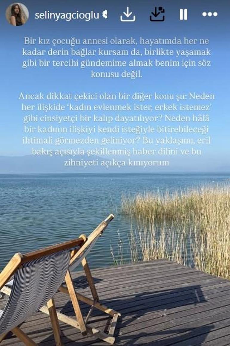 ‘Bir kız çocuğu annesi olarak, hayatımda her ne kadar derin bağlar kursam da, birlikte yaşamak üzere bir tercihi gündemime almak benim için kelam konusu değil. Lakin dikkat alımlı olan bir başka bahis şu: Neden her alakada ‘kadın evlenmek ister, erkek istemez’ üzere cinsiyetçi bir kalıp dayatılıyor? Neden hâlâ bir bayanın ilgiyi kendi isteğiyle bitirebileceği ihtimali görmezden geliniyor? Bu yaklaşımı, eril bakış açısıyla şekillenmiş haber lisanını ve bu zihniyeti açıkça kınıyorum.’