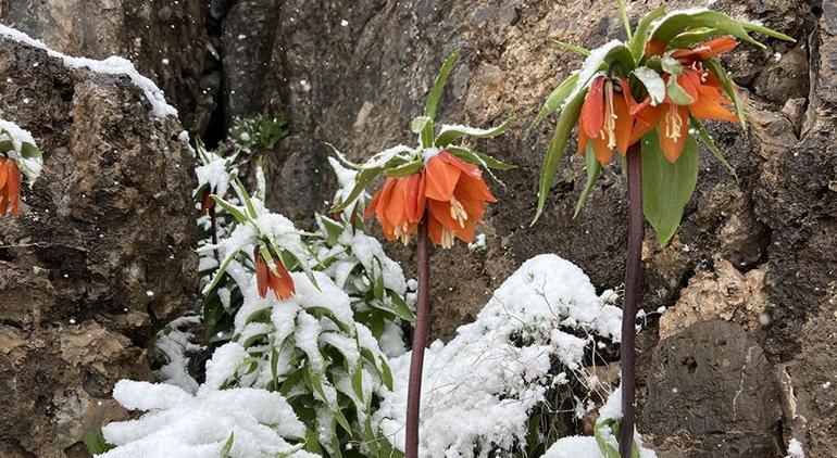 İlçenin Tanin Dağları’nda doğal olarak yetişen, halk ortasında “ağlayan gelin” yahut “hüzün çiçeği” olarak bilinen zıt laleler, baharın gelişiyle açtı. Havaların soğumasıyla kar yağışının tesirli olduğu bölgede aykırı laleler beyaz örtüyle kaplandı.