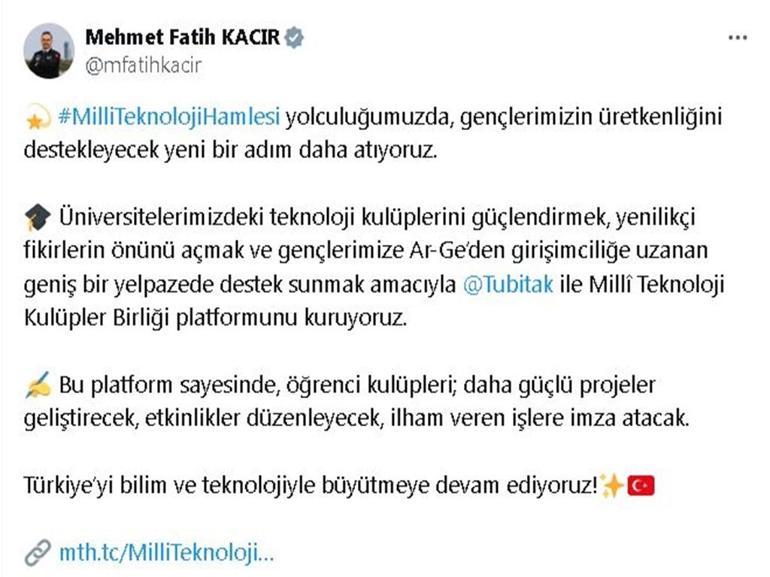 Bakan Kacır, toplumsal medya hesabından yaptığı açıklamada, “Milli Teknoloji Atağı seyahatimizde, gençlerimizin üretkenliğini destekleyecek yeni bir adım daha atıyoruz. Üniversitelerimizdeki teknoloji kulüplerini güçlendirmek, yenilikçi fikirlerin önünü açmak ve gençlerimize Ar-Ge’den girişimciliğe uzanan geniş bir yelpazede takviye sunmak maksadıyla TÜBİTAK ile Milli Teknoloji Kulüpler Birliği platformunu kuruyoruz. Bu platform sayesinde, öğrenci kulüpleri; daha güçlü projeler geliştirecek, etkinlikler düzenleyecek, ilham veren işlere imza atacak. Türkiye’yi bilim ve teknolojiyle büyütmeye devam ediyoruz” tabirlerini kullandı.