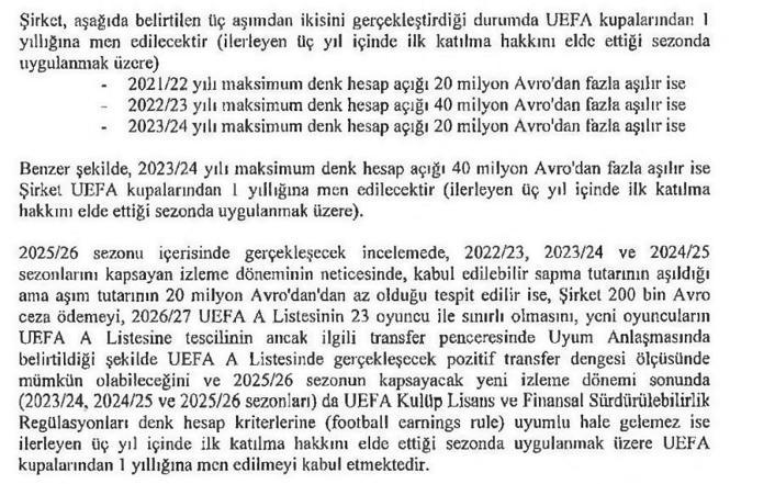 (Bu şu demek; UEFA ile gerçekleşen Yapılanma Mutabakatı’na nazaran, şirket, 4 milyon euroya önlem konulmasını kabul etmişti. Buna nazaran 600 bin euro önkoşulsuz olarak ceza kesildi. Kalan 3.4 milyon euronun 1.6 milyon eurosu, 2022-23 periyodunda 40 milyon euro amacı aşıldığı takdirde kesilecekti -ki Lider Adalı’nın söylediği tam da bu oldu. Tıpkı kaygı, 2023-24 döneminde da kulübün yakasında… Gerçekleşmiş midir bilemem. Lakin iş para cezasıyla da bitmiyor. Bu son sorguladığım hesap devrinde de 20 milyon eurodan fazla bir aşım varsa, iki ihlal olduğu için UEFA kupalarından bir yıl men cezası gelecek. Ayrıyeten, 2023-24 döneminde denk hesap açığı 40 milyon euronun üzerinde olursa da 1 yıl kupalara gidilemeyecek. Umarım bunu da görmeyiz.)