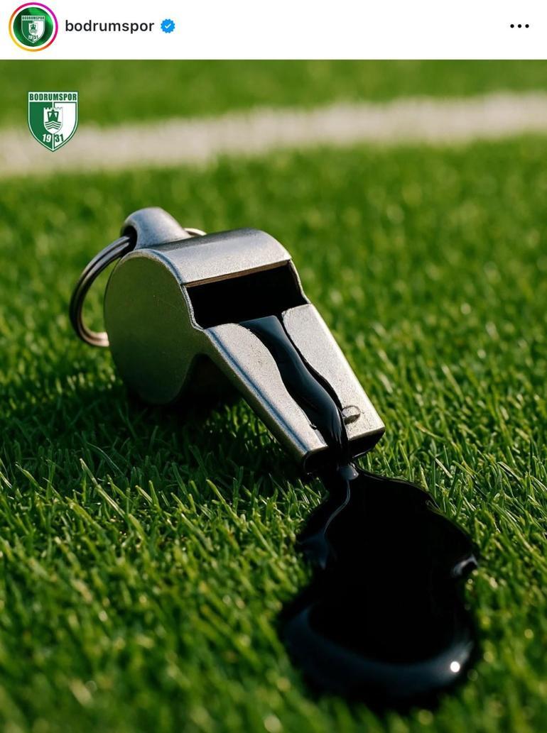 Öte yandan Bodrum FK’nın resmi hesabından paylaştıkları fotoğraf ise tartışma konusu oldu. Alanda yerde duran hakem düdüğünden akan kan biçimindeki görsel dikkat çekti.