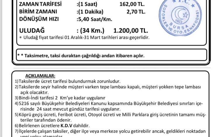 Bursa’da 11 Ağustos 2024 tarihinden itibaren geçerli olmak üzere taksi ücretlerine zam yapıldı.  Artan maliyetler ve ekonomik koşulların da etkisiyle açıklanan yeni taksi ücret tarifesine göre, indi-bindi ücreti 70 liradan, 90 liraya yükseltildi.
