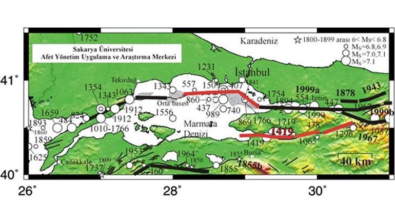 Marmara Bölgesi’nde Kuzey Anadolu Fay Zonu’nun uzanımı ve tarihi sarsıntıların yerleri. Kırmızı çizgiler içinde bulunduğumuz yüzyılda 1999 İzmit-Adapazarı zelzelesi büyüklüğü civarında sarsıntı üretme potansiyeli yüksek olan yerleri gösteriyor.