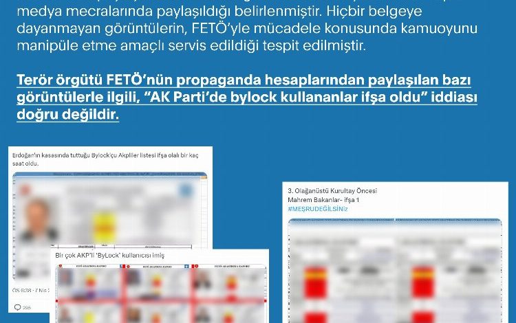 İletişim Başkanlığı Dezenformasyonla Mücadele Merkezi, kurulduğu günden bu yana asılsız iddiaların gerçeğini paylaşmak için çalışma sürdürürken, yapılan son paylaşımda, terör örgütü FETÖ’nün propaganda hesaplarından paylaşılan bazı görüntülerle ilgili, “AK Parti’de ByLock kullananlar ifşa oldu” iddiasının doğru olmadığını aktardı.