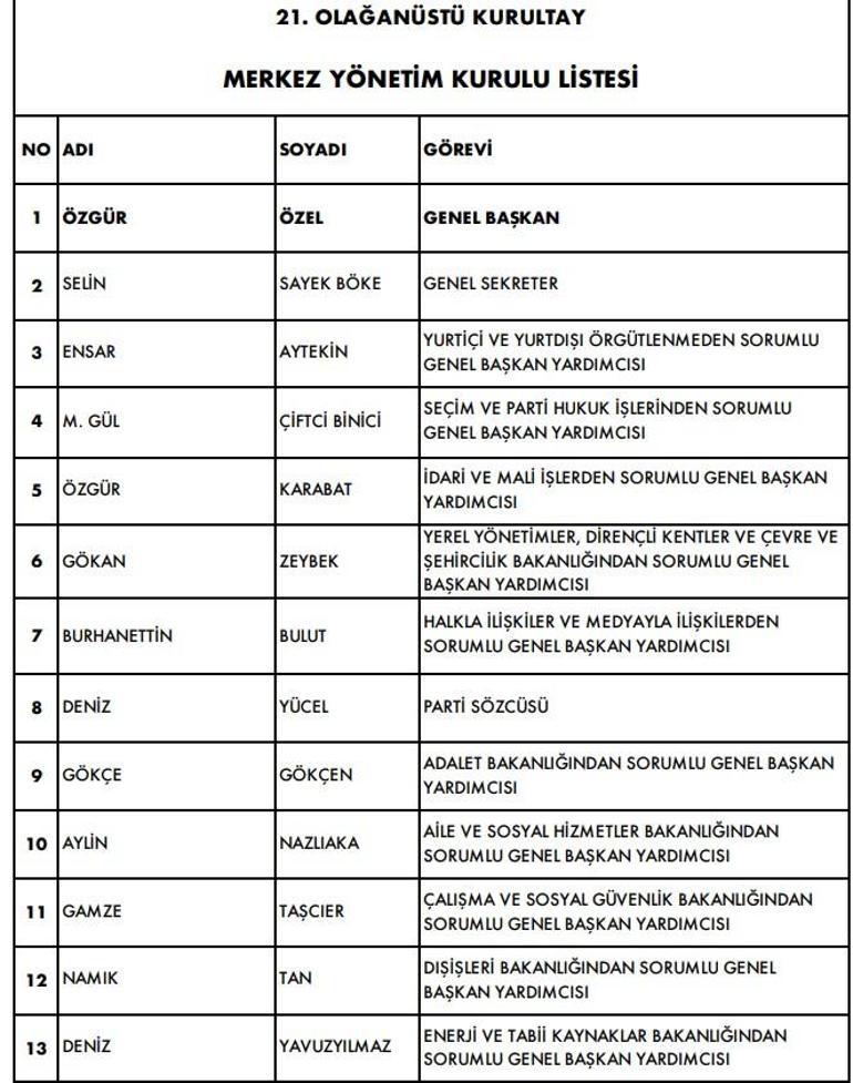 Merkezi Yönetim Kurulu üyeleri de burada belirlendi. MYK listesi şu isimlerden oluştu: “Selin Sayek Böke, Ensar Aytekin, Gül Çiftci Binici, Özgür Karabat, Gökan Zeybek, Burhanettin Bulut, Deniz Yücel, Gökçe Gökçen, Aylin Nazlıkaya, Gamze Taşcıer, Namık Tan, Deniz Yavuzyılmaz, Sevgi Kılıç, Yalçın Karatepe, Murat Bakan, Gülşah Deniz Atalar, Suat Özçağdaş, Yankı Bağcıoğlu, Zeliha Aksaz Şahbaz, Pınar Uzun Okakın, Erhan Adem, Mehmet Necati Yağcı, Ulaş Karasu.”