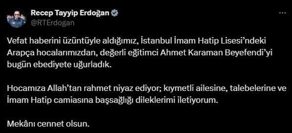 Erdoğan iletisinde, “Vefat haberini hüzünle aldığımız, İstanbul İmam Hatip Lisesi’ndeki Arapça hocalarımızdan, kıymetli eğitimci Ahmet Karaman beyefendiyi bugün ebediyete uğurladık. Hocamıza Allah’tan rahmet niyaz ediyor; değerli ailesine, talebelerine ve imam hatip topluluğuna başsağlığı dileklerimi iletiyorum. Yeri cennet olsun.” sözlerini kullandı.