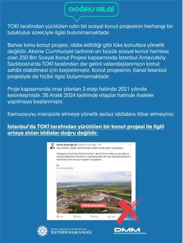 Bahse husus konut projesi, argüman edildiği üzere lüks konutlara yönelik değildir. Tersine Cumhuriyet tarihinin en büyük toplumsal konut atılımı olan 250 Bin Toplumsal Konut Projesi kapsamında İstanbul Arnavutköy Sazlıbosna’da TOKİ tarafından dar gelirli vatandaşlarımızın konut sahibi olabilmesi için başlatılmıştır. Konut projesinin, Kanal İstanbul projesiyle de hiçbir ilgisi bulunmamaktadır.