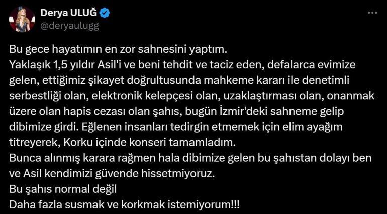 Ünlü müzikçi, uzun müddettir kendisini ve sevgilisi Asil Gök’ü tehdit ve taciz eden bir kişinin, uzaklaştırma kararı ve elektronik kelepçesi olmasına karşın İzmir’deki konserine geldiğini ‘X’ hesabından duyurdu. Sahnede yaşadığı endişe dolu anları takipçileriyle paylaşan Uluğ, yardım davetinde bulundu.