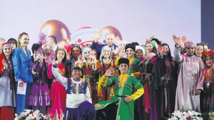 Cumhurbaşkanı Erdoğan’ın konuşmasının akabinde sahneye dünya çocukları davet edildi. Kırgızistan’dan gelen çocuklar 23 Nisan müziğini söylerken, Erdoğan da sahnede çocuklarla kameralara poz verdi. 30 ülkeden 600 çocuk, kendi fotoğrafları ile Cumhurbaşkanı Erdoğan’ın çocuklara olan sevgisini gösteren bir kolaj hazırladı. Bu tablo TRT Genel Müdür Zahid Sobacı tarafından Erdoğan’a takdim edildi. Ayrıyeten çocukların 23 Nisan ile ilgili his ve fikirlerinin yer aldığı kitap da Erdoğan’a armağan edildi.