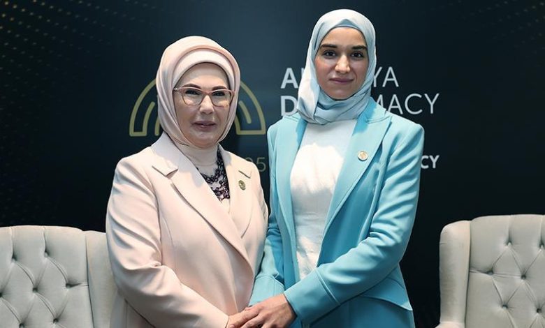 Emine Erdoğan, 4. Antalya Diplomasi Forumu (ADF) kapsamında Türkiye’ye gelen Latife El Durubi ile Nest Kongre ve Fuar Merkezi’nde görüşme gerçekleştirdi. El Durubi ve Emine Erdoğan görüşmede, Suriye’de bayanlar ve çocuklarla ilgili yapılabilecek ortak çalışmaları ele aldı.