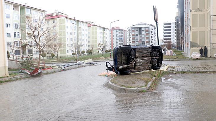 Yıldızkent semtinde binanın çatısından uçan sac ve direkler, yaklaşık 100 metre ileride Çat Yolu TOKİ’ler içerisinde park halindeki aracın üzerine düştü. Şiddetli rüzgarın da tesiriyle yan yatan araçta hasar oluştu.