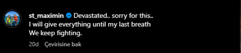 Fenerbahçe’nin yıldız futbolcusu Allan Saint-Maximin de toplumsal medya hesabından Kayserispor maçı için bir paylaşımda bulundu ve şu sözleri lisana getirdi: Yıkıldım.. bunun için üzgünüm.. Son nefesime kadar her şeyimi vereceğim. Savaşmaya devam edeceğiz.