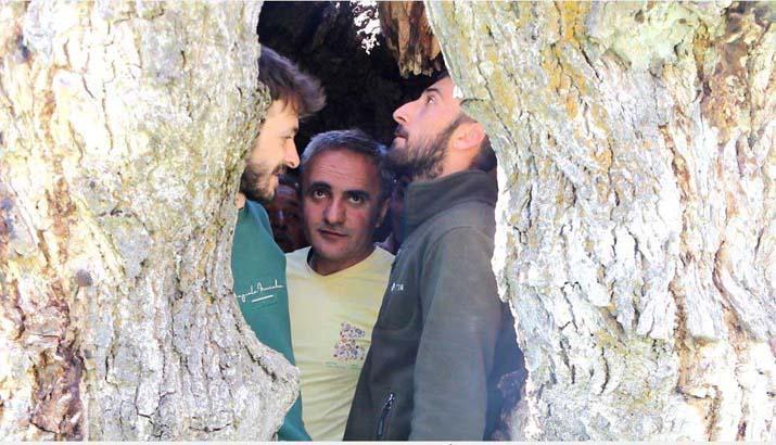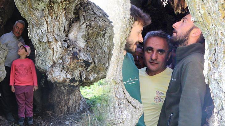 Beldenin simgesi haline gelen asırlık ağacın oyuğuna 3’ü çocuk 12 kişi sığdığı anlar ilgi çekti.