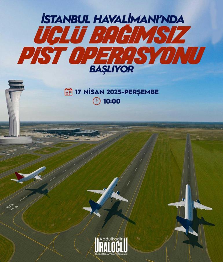 Ulaştırma ve Altyapı Bakanı Abdulkadir Uraloğlu, İstanbul Havalimanı’nda mevcut pistlerin kullanımını en verimli hale getirecek “Eş Vakitli Üçlü Bağımsız Pist Operasyonları” uygulamasının 17 Nisan Perşembe günü saat 10.00’da başlayacağını açıkladı.