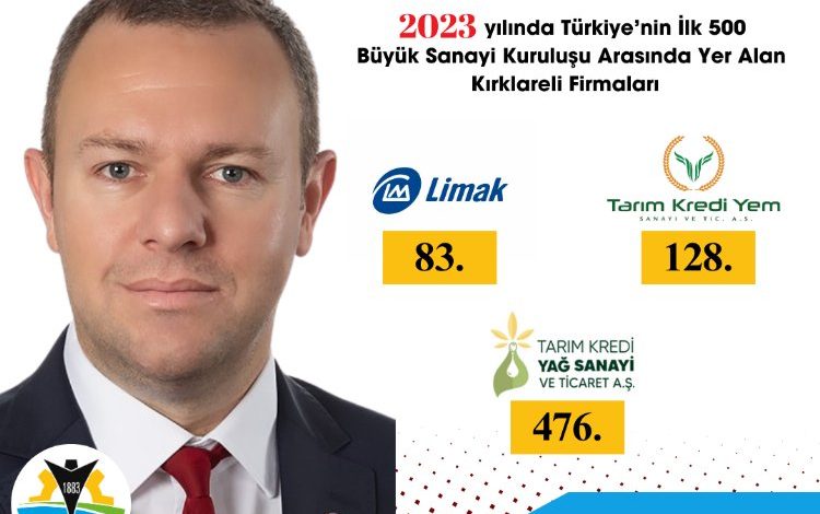 Erdoğan DEMİR / KIRKLARELİ (İGFA) – Kırklareli Ticaret ve Sanayi Odası Yönetim Kurulu Başkanı Soner Ilık yaptığı açıklamasında;“İstanbul Sanayi Odası (İSO) tarafından yayınlanan “Türkiye’nin 500 Büyük Sanayi Kuruluşu 2023 Listesi”nde Kırklareli’nden; Limak Çimento Sanayi ve Ticaret Anonim Şirketi 83. Sıra’da, Tarım Kredi Yem Sanayi ve Ticaret Anonim Şirketi 128. Sıra’da, Tarım Kredi Yağ Sanayi ve Ticaret Anonim Şirketi 476. Sıra’da yer aldı. Firmalarımızı tebrik eder, başarılarının artarak devamını dilerim” dedi.