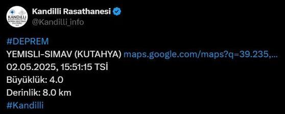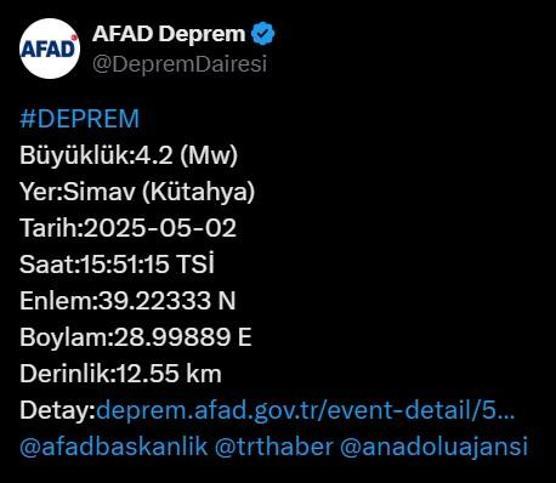 Kütahya’nın Simav ilçesinde saat 15.51’de sarsıntı meydana geldi. 4.2 büyüklüğündeki sarsıntının akabinde AFAD dataları paylaştı. Sarsıntının derinliği ise 12.55 km olarak açıklandı.