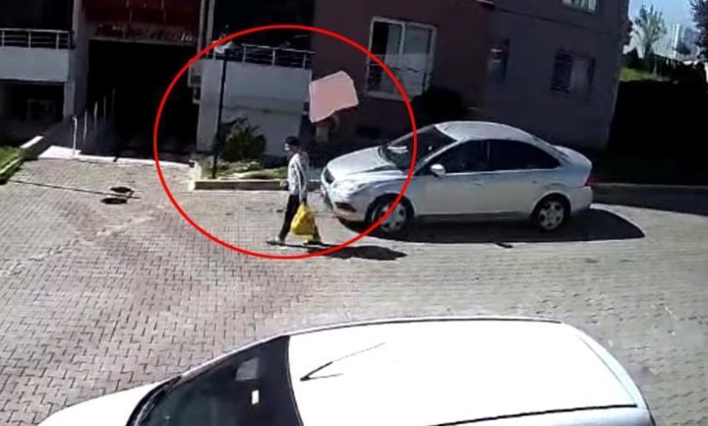 Çocuk kılpayı kurutulurken, fayansın isabet ettiği park halindeki arabada ise küçük çapta hasar meydana geldi. O anlar ise yakında bulunan bir iş yerinin güvenlik kamerası tarafından saniye saniye görüntülendi. Neye uğradığını şaşıran çocuk daha sonra meskenine gitti.