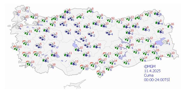 Çok bulutlu, gece saatlerinden itibaren aralıklı yağmur ve karla karışık yağmurlu geçeceği kestirim ediliyor. Yağışların, bu gece saatlerinde yer yer kuvvetli olması bekleniyor.