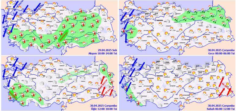 RÜZGAR: Çoklukla kuzey ve kuzeydoğu, güneydoğu kesitlerde güneybatılı istikametlerden hafif, orta sıra orta kuvvette, Marmara ile Kuzey Ege kıyılarında kuzeydoğu istikametlerden kuvvetli ve fırtına (40-70 km/saat) halinde, Doğu Anadolu’nun güneydoğusunda güneybatılı taraflardan kuvvetli (40-60 km/sa) esmesi bekleniyor.