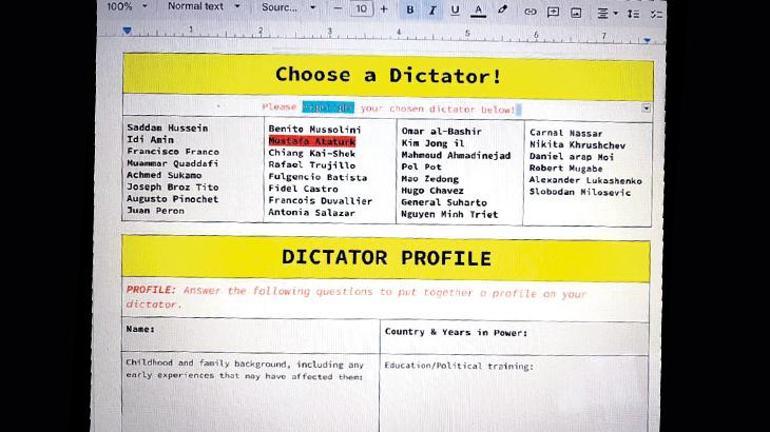 Edmonton kentinde bir lisede İlayda Güvenç’e verilen Atatürk’ü Saddam, Mussolini ve Milosevic üzere diktatörlerle birebir listeye konduğu “Bir Diktatör Seç” isimli toplumsal bilgiler ödevinin ekran manzarası.