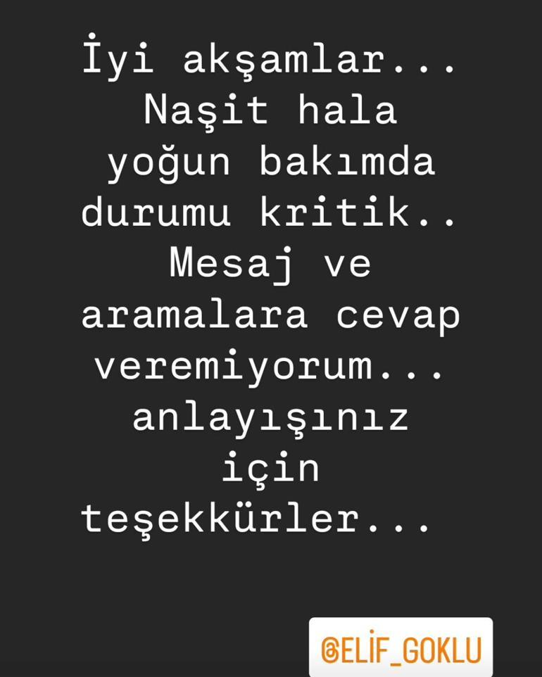 Elif Göklü, oyuncunun şahsî Instagram hesabından son yaptığı paylaşıma “Naşit hala ağır bakımda, durumu kritik. İleti ve aramalara yanıt veremiyorum. Anlayışınız için teşekkürler” notunu düştü.