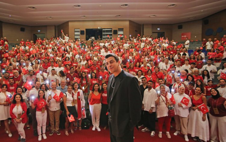 Etkinlik, Norm Ender’in sahnede “Parla” marşını gönüllülerle birlikte söylemesiyle devam etti. Katılımcılar, kırmızı ve beyaz kıyafetleriyle Türk bayraklarını sallayarak şarkıya eşlik etti. Salonun her köşesinden yükselen coşku dolu sesler, unutulmaz anlar yaşattı.