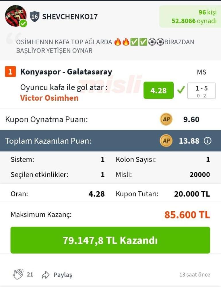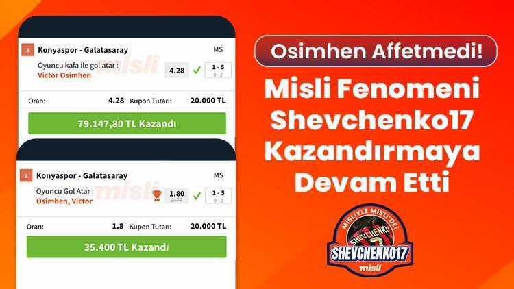 Misli fenomeni Shevchenko17 ise 4.28 orandan Osimhen Başla Gol Atar ve 1.80 orandan ise Osimhen Gol Atar varsayımını tutturarak toplamda 114.547 TL kazandı. Shevchenko17 bu kuponlarıyla Misli Arena’da günün “En Âlâ 20” kuponu ortasında yer aldı.