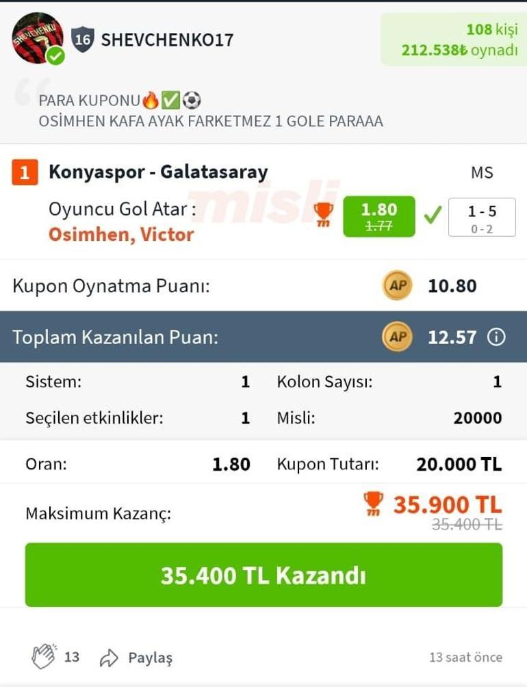 İşte Shevchenko17’nin Misli Arena’da hem kazandığı hem de kazandırdığı o kuponlar…