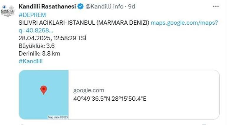 İstanbul’da 6.2’lik sarsıntıyla başlayan zelzele fırtınası devam ediyor. Kandilli’den yapılan açıklamaya nazaran Silivri açıklarında bir zelzele daha meydana geldi. Saat 12.58’deki zelzelenin büyüklüğü 3.6 olarak aktarılırken, derinlik ise 3.8 kilometre olarak belirtildi.