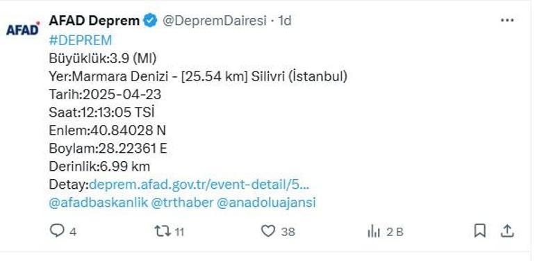 Afet ve Acil Durum İdaresi Başkanlığının (AFAD) internet sitesinde yer alan bilgiye nazaran, Silivri açıklarında zelzele oldu.