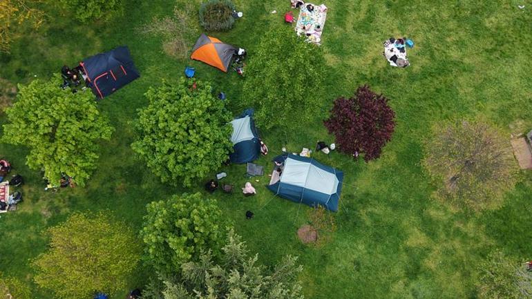 Bağcılar Millet Bahçesi’nde toplanan yüzlerce vatandaştan kimileri, uzun müddetli burada vakit geçirmek için kamp çadırı kurdu.