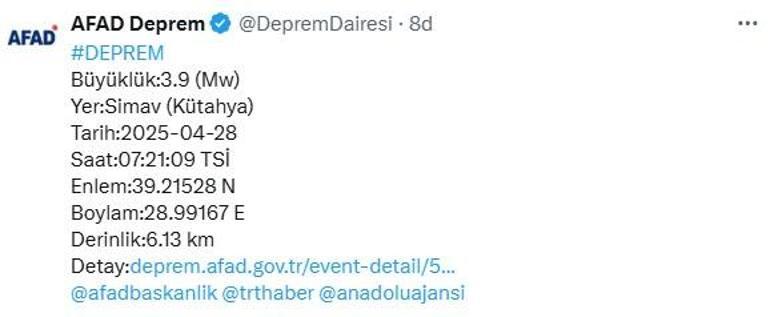 AFAD’dan yapılan açıklamada, Kütahya’nın Simav ilçesinde 3.9 büyüklüğünde bir zelzele meydana geldiği belirtildi. Saat 07.21’deki sarsıntının derinliğinin 6 kilometre olduğu aktarıldı.
