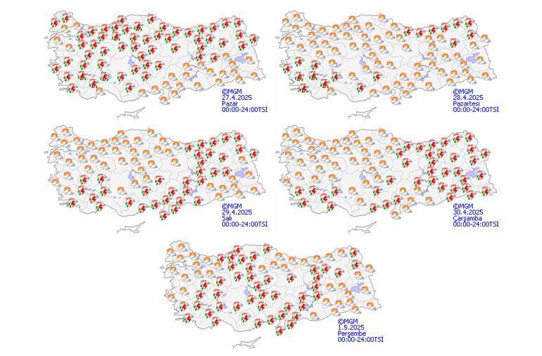Meteoroloji Genel Müdürlüğü tarafından yapılan iddialara nazaran: Ülkemiz genelinin modüllü ve çok bulutlu, Marmara’nın güney ve doğusu, Ege (Muğla kıyıları hariç), Batı Akdeniz, İç Anadolu, Karadeniz, Doğu Anadolu (Malatya hariç), Güneydoğu Anadolu’nun doğusu ile Edirne ve Kırklareli etraflarının lokal sağanak ve gök gürültülü sağanak yağışlı geçeceği kestirim ediliyor. Yağışların, Göller Yöresi, Uşak ve Afyonkarahisar’ın güneyi, Bolu ve Kastamonu, Çankırı’nın batı, Ankara ve Çorum’un kuzey ilçeleri ile Bingöl, Muş, Bitlis, Şırnak ve Hakkâri etraflarında kuvvetli olması bekleniyor.