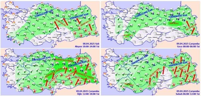 KUVVETLİ YAĞIŞ UYARISI (İç Anadolu): Yapılan son değerlendirmelere nazaran: İç Anadolu’nun doğusunda, yarın (Çarşamba) öğlen saatlerinden itibaren yağmur ve sağanak formunda başlayacak olan yağışların; Niğde, Kayseri ve Sivas etraflarında mahallî kuvvetli, gece saatlerinde karla karışık yağmur ve kar yağışına dönerek Perşembe (10.04.2025) günü sabah saatlerine kadar Niğde vilayet geneli ile Kayseri ve Sivas’ın güney ve doğusunda yer yer kuvvetli kar (5-20 cm) formunda olması bekleniyor. Sel, su baskını, buzlanma ve don olayına bağlı ulaşımda aksamalar ve tipi üzere aksiliklere karşı dikkatli ve önlemli olunması gerekmektedir.