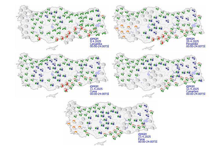 Meteoroloji Genel Müdürlüğü tarafından yapılan kestirimlere nazaran: Ülkemiz genelinin kesimli ve çok bulutlu, Güney ve İç Ege, Akdeniz, İç Anadolu, Karadeniz ve Doğu Anadolu ile Güneydoğu Anadolu’nun kuzey ve doğusunun yağışlı geçeceği iddia ediliyor. Yağışların ekseriyetle yağmur ve sağanak, güney ve doğu kesitlerde yer yer gök gürültülü sağanak, Karadeniz’in iç kısımlarının yüksekleri ve Doğu Anadolu’nun kuzeyinin yükseklerinde karla karışık yağmur ve kar biçiminde olması bekleniyor. Yağışların İç Anadolu’nun doğusu, Orta Karadeniz, Doğu Karadeniz’in doğusu ve Doğu Anadolu’nun kuzeybatı ve güneydoğusunda yer yer kuvvetli olacağı kestirim ediliyor. Doğu Anadolu’nun güneydoğusu ve Güneydoğu Anadolu’da toz taşınımı bekleniyor.