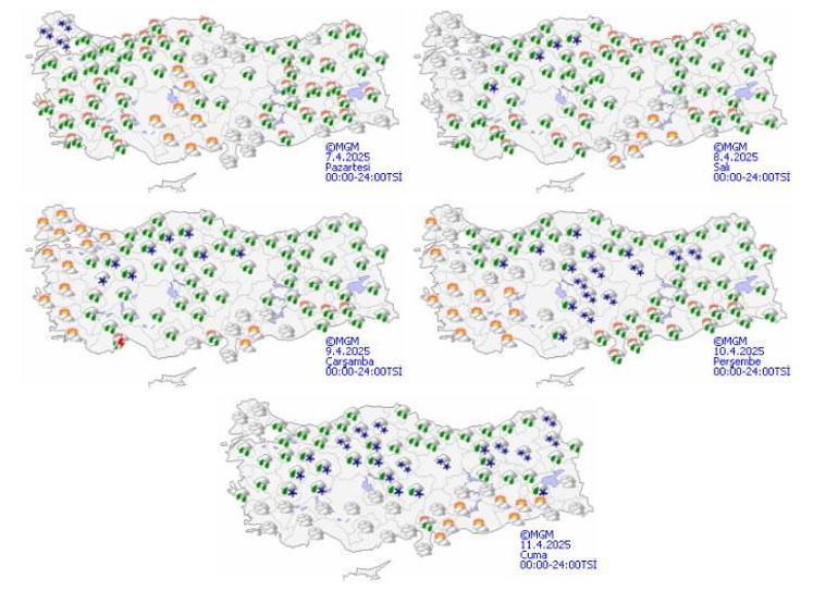 Trakya, Batı Karadeniz’in iç kesitlerinin yüksekleri ile Doğu Anadolu’nun kuzeyinin yüksek kısımlarında karla karışık yağmur ve kar; yağış alan başka yerlerde yağmur ve sağanak formunda görülmesi beklenen yağışların Marmara, Kıyı Ege ile Manisa, Ardahan, Kars, Erzurum, Tunceli, Muş ve Bingöl etraflarında lokal kuvvetli olması bekleniyor. Rüzgarın, Marmara’da kuzey ve kuzeydoğu, Orta ve Doğu Karadeniz kıyılarında batı ve kuzeybatı, Ege ve Akdeniz’in iç kısımları, İç Anadolu’nun güney ve doğusu, Karadeniz’in iç bölümleri, Doğu Anadolu ile Güneydoğu Anadolu’nun kuzeyinde güney ve güneybatı taraflardan kuvvetli ve kısa müddetli fırtına (40-70 km/sa) formunda eseceği iddia ediliyor.