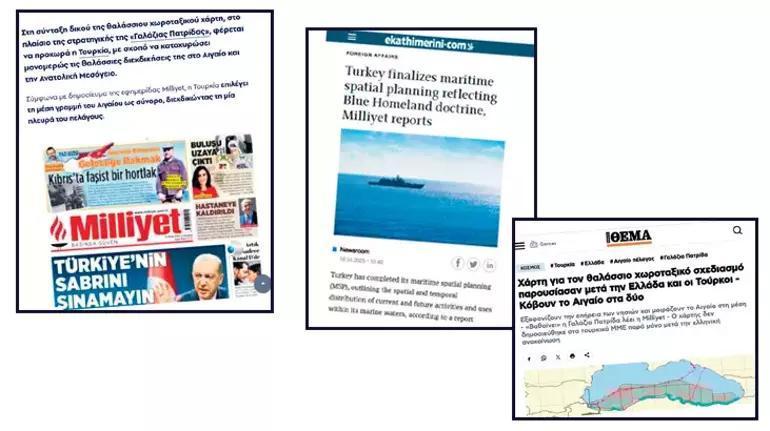 Milliyet’in dün birinci sayfasında yer alan “Mavi Vatan Derinleşiyor” haberi, Yunanistan’da geniş çaplı yankı uyandırdı. Kathimerini, haberinin başlığında, “Milliyet’in haberine nazaran, Türkiye, Mavi Vatan Doktrini’ni yansıtan deniz mekansal planlamasını tamamladı” tabirini kullandı. “Türk haritası Ege Denizi’ni ikiye bölüyor, sırada Kıbrıs var” başlığını kullanan Philenews sitesinde, “Milliyet’in haberine nazaran Türkiye, Ege Denizi’nin orta sınırını hudut olarak seçiyor ve denizin bir tarafını talep ediyor” denildi. Protothema’da ise haber, “Ege’yi ikiye böldüler. Adaların tesirini ortadan kaldırıyorlar ve Ege Denizi’ni ikiye bölüyorlar. Milliyet, ‘Mavi Vatan derinleşiyor’ diyor” sözleri ile sunuldu.