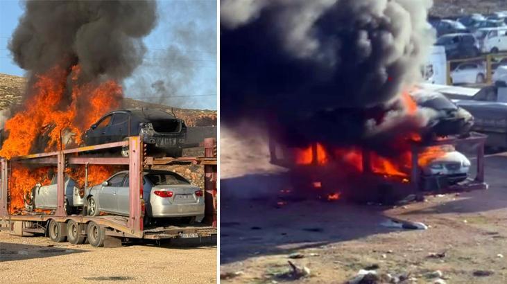 Hatay’da bulunan Cilvegözü Hudut Kapısı’ndan Suriye’ye geçmeyi bekleyen tırda yüklü araçlar alevlere teslim oldu. Yangında 6 araç yanarak kullanılamaz hale geldi.