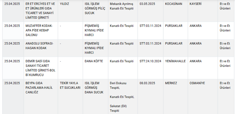 – EFEKÖY ET ÜRÜNLERİ-MEHMET BIRAKOĞLU tarafından üretilen TEKİR YAYLASI marka sucuklarda kanatlı eti tespit edildi.