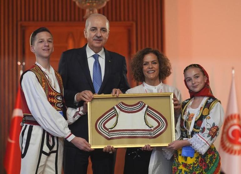 Törenin akabinde Kurtulmuş, yöresel kıyafetleriyle Meclis’e gelen çocuklarla Erdem Kapısı merdivenlerinde fotoğraf çektirdi.