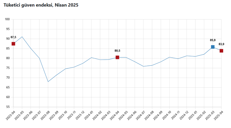 Türkiye İstatistik Kurumu ve Türkiye Cumhuriyet Merkez Bankası işbirliği ile yürütülen tüketici eğilim anketi sonuçlarından hesaplanan tüketici inanç endeksi, Mart ayında 85,9 iken Nisan ayında %2,3 oranında azalarak 83,9 oldu.