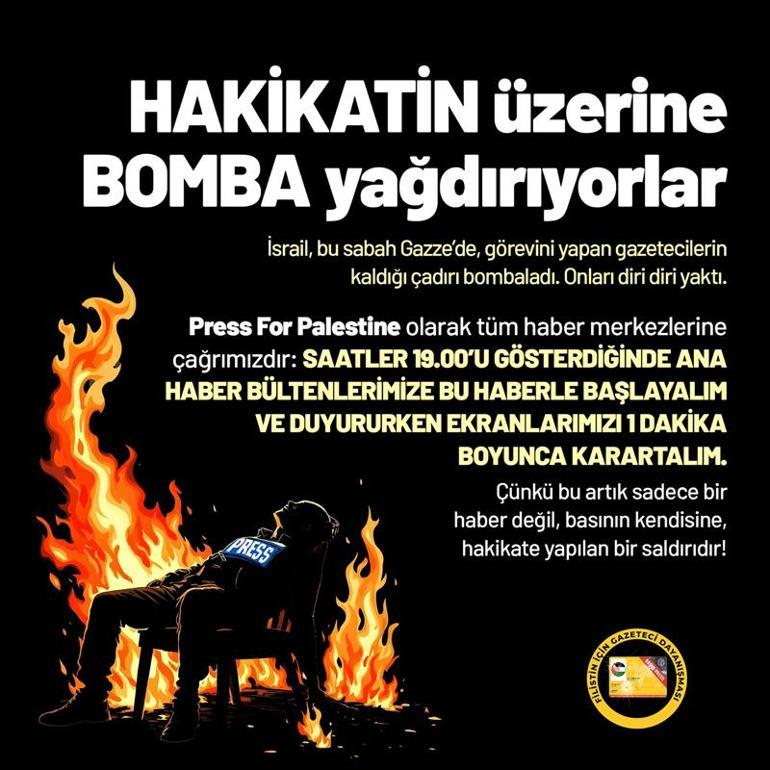 Platform, açıklamasında, “Press For Palestine olarak tüm haber merkezlerine davetimizdir: Saatler 19.00’ı gösterdiğinde ana haber bültenlerimize bu haberle başlayalım ve duyururken ekranlarımızı 1 dakika boyunca karartalım. Zira bu artık yalnızca bir haber değil, basının kendisine, hakikate yapılan bir saldırıdır!” bildirisi paylaşıldı.