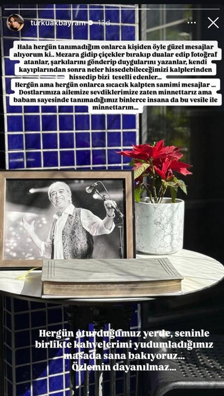 Babasının vefatının birinci ayında duygusal bir paylaşım yapan Türkü Akbayram, “Bir su damlası olup gökyüzünden okyanusa, sana karışacağım güne kadar “şimdilik” hoşçakal benim canım, biricik, çınarım dağım Babam” demişti.