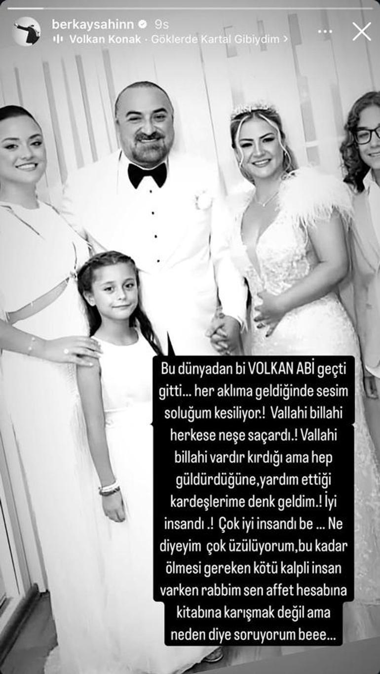Volkan Konak’ın ailesiyle olan fotoğrafını Instagram hesabından paylaşan Berkay Şahin, “Bu dünyadan bir Volkan ağabey geçti gitti… Her aklıma geldiğinde sesim soluğum kesiliyor! Vallahi billahi herkese neş saçardı. Vallahi billahi vardır kırdığı lakin daima güldürdüğüne, yardım ettiği kardeşlerime denk geldim. Güzel insandı! Çok düzgün insandı be… Ne diyeyim çok üzülüyorum, bu kadar ölmesi gereken makus kalpli insan varken Rabbim sen affet hesabına kitabına karışmak değil lakin neden diye soruyorum…” sözlerini kullandı.