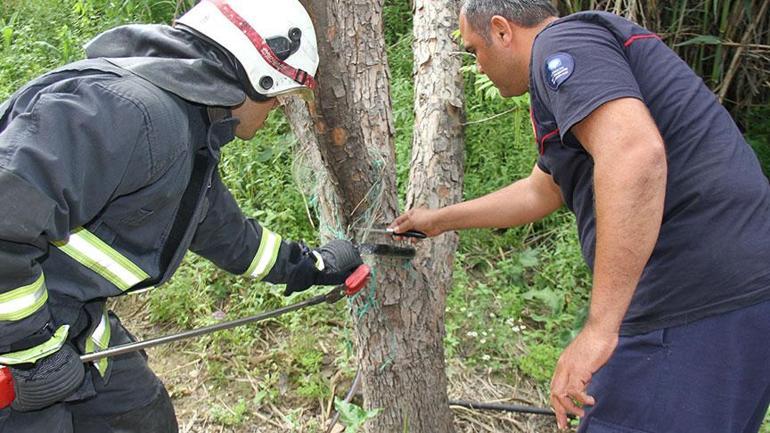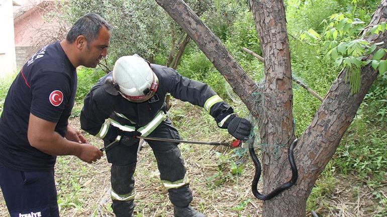 Kökez Mahallesi Belkıs mevkisinde, konutun bahçesindeki ağaçta yer alan balık ağına dolanan yılanı çırpınırken gören kişi, durumu yetkililere bildirdi. İhbar üzerine olay yerine itfaiye grubu sevk edildi.